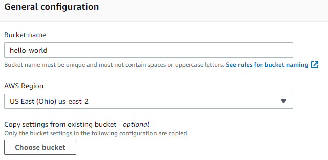 I think "Hello_World" would be a good name for this bucket... oh, except bucket names can only have lowercase letters, numbers, periods, and hyphens... and must be unique Alright, "hello-world-jg-cr-1" it is. I don't know what the advantages to the different regions are, but given that I'll likely be the only traffic to this site, I'll chosen US East (Ohio) us-east-2 since I'm in the US Midwest.