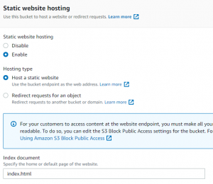 It seems this step also takes care of the "Configuring an Index Document" step I anticipated from above. I enter "index.html" as my index document, so AWS knows what file to serve up when users access the "root" of the bucket.