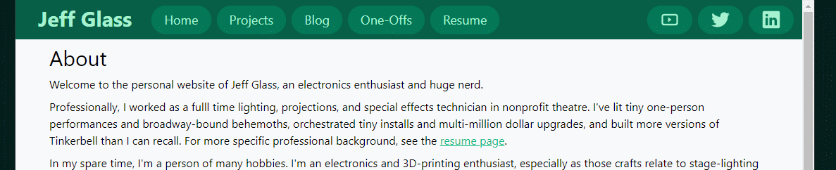 So, let's see how tailwindcss can handle mobile-responsive designs. It seems that I've actually being going at the framework somewhat backward from how tailwind thinks about attributes. Any css attributes that do not have a size selector (sm, md, lg, xl, or 2xl) apply to all sizes of page; any attributes that do have a selector will apply on that screen size and above. So, as I'm going back and shoehorning mobile-friendliness into my site, I'll mostly be applying size selectors (probably lg or xl) to my existing css attributes, then adding new, un-size-tagged attributes that are mobile-appropriate.