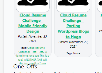 It was at this point that I decided on a change of tactics. I already have the option in the snippet above to include a custom 'slug' of text for each post, which will always be the priority for each summary. If that's not there, I want to default to the auto-generated summary of each post.... but is that really the right behavior on the homepage? Perhaps simply the title, post date, and a list of associated tags is more correct? I'll borrow from code from how tags are displayed on posts themselves (in layout/post/single.html) to try that out.