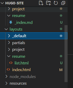 So, I'll create a new file in my content called "/resume/resume.md", as well as a new file in my layouts folder called resume.html.html... except I can tell by poking at the content of these two files that resume.md is being used as the content within the default single.html template. So let's try this another way around - I'll create a /layouts/resume/_index.md file with frontmatter for my new resume page, and a layouts/resume/list.html file. That way, the {{site}}/resume URL points to the "list page for resumes"... which will just be my resume page. It seems like perhaps there'd be a better way to do this, but this certainly works.