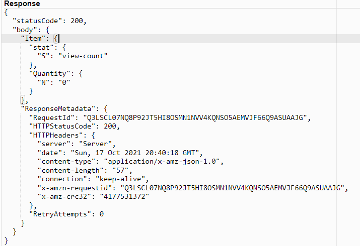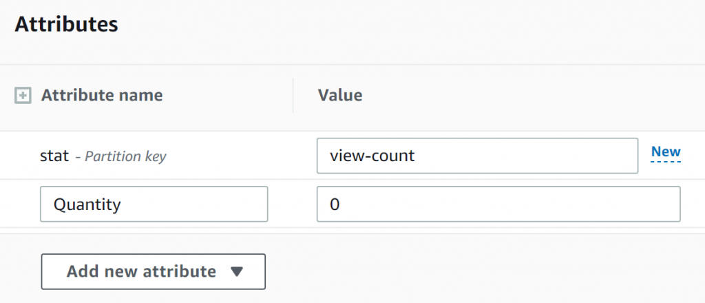 With the table setup, I'll add a single Item with the stat "view-count" and starting at quantity zero. This for now will be the only item in our database, and will track our view-count.