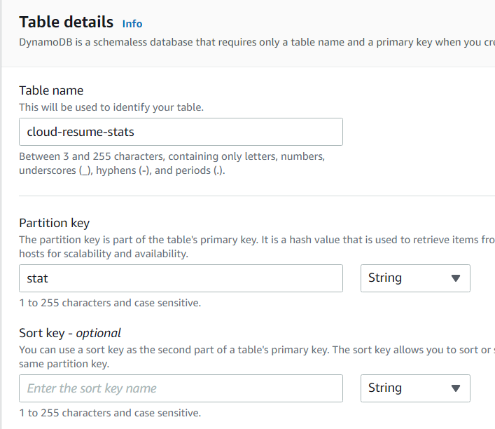 Assuming at some point I might want to track some other kinds of stats for this site, I'll create a table called "cloud-resume-stats" with a partition key called "stats" from the DynamoDB UI. At first, the only "stat" will be the visitor count, but perhaps there will be other things to track later. Or not.