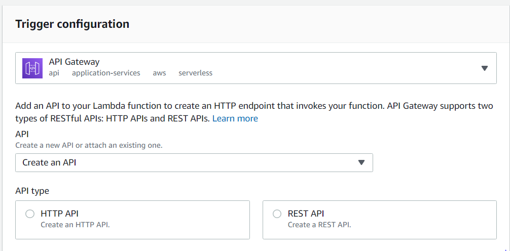 It looks like one of the options for triggers is via the AWS API Gateway, which is handy, since that's another piece of the Cloud Resume Challenge. And when selected, an option appears to select an existing API... or create a new one right here. Well that's handy.