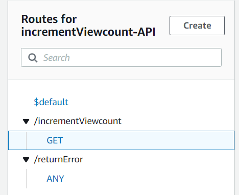 At least I can confirm that the API Gateway is seeing a GET request as expected. Ah, and if I make a request to https://api.jeff.glass/incrementViewcount, i get the incremented and returned view count as expected. And if I configure the /error URL to trigger the seperate error lambda (which just returns code 403), I can trigger that as well. But clearly there's something I don't understand about the way the /ANY route acts to route to integrations. When I create a route like ANY /{greedy}, the Cloudwatch logs do show the correct route being selected. But I still get a code 500 internal server error, as if the Lambda itself isn't running. On the other hand, this additional error handling Lambda is overkill, so I can just bin it. I'll make a mental post-it note to deepen my understanding of the ANY and {greedy} functionality though.